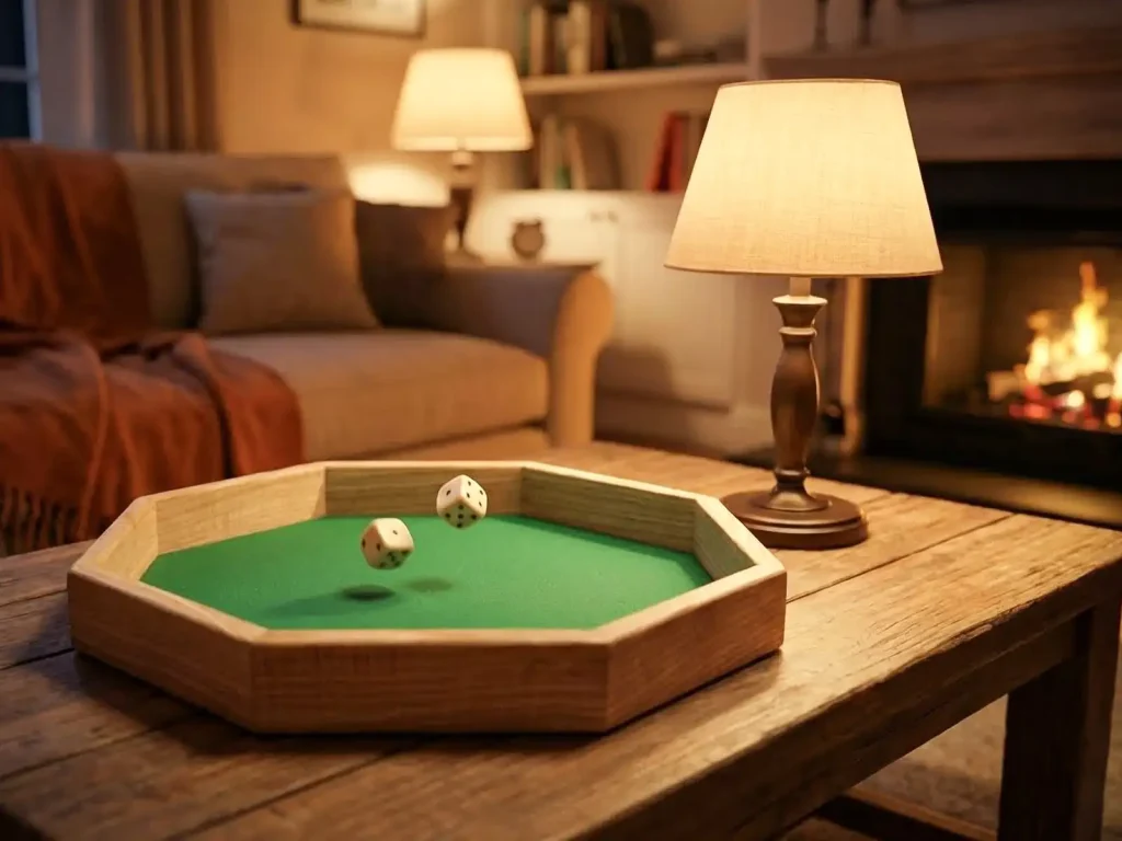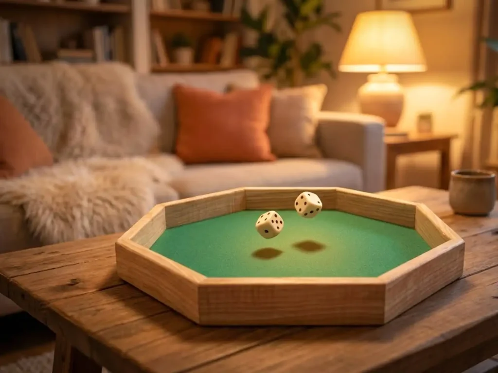 Dieses achteckige Würfelbrett sorgt für ruhige Würfelwürfe, schützt den Tisch und bringt mit seinem grünen Filzbelag ein klassisches Spielgefühl nach Hause.